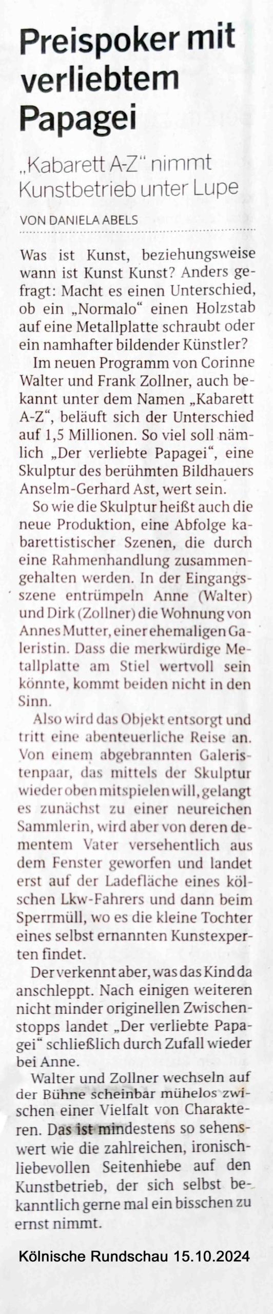 „Der verliebte Papagei“, das Werk eines berühmten Bildhauers, landet versehentlich auf dem Sperrmüll und wechselt rasant die dubiosesten Besitzer. Geldgierige Galeristen, senile Schlachtweiber, kölsche LKW-Fahrer, löchernde Kids, brabbelnde Rentner, brotlose Künstler, philosophische Putzfrauen und ein erotischer Straßenkater mit Heißhunger auf seltsame Nahrung sorgen für Lachmuskel-Training mit Überraschungsknall!